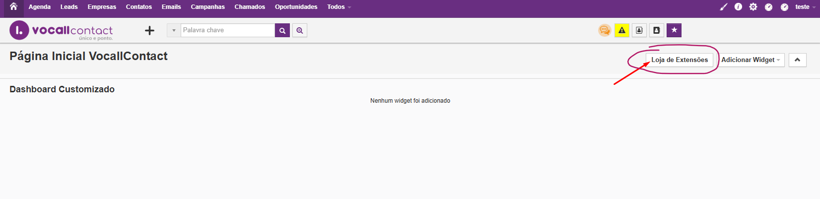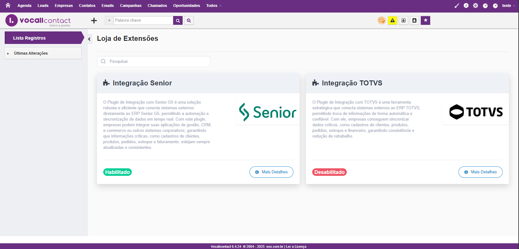 Passo 1: Explore a Loja de Extensões Acesse o novo menu de extensões (padronizado com o tema Inspinia) para visualizar os módulos de integração disponíveis. Esta tela substitui módulos antigos e centraliza todas as capacidades de expansão do CRM em um único ambiente moderno e intuitivo.
