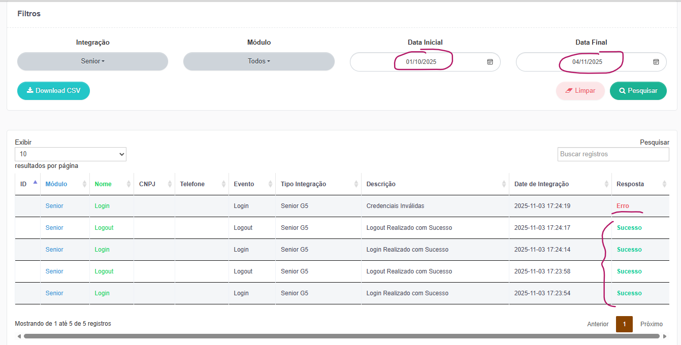 - Funcionamento: Através do módulo de Monitoramento de Integrações, o administrador visualiza o status (sucesso, erro ou pendente) e a mensagem de retorno de cada importação. É possível filtrar os registros por data, tipo de dado ou status, e realizar a exportação em CSV para auditorias externas ou conciliações financeiras.