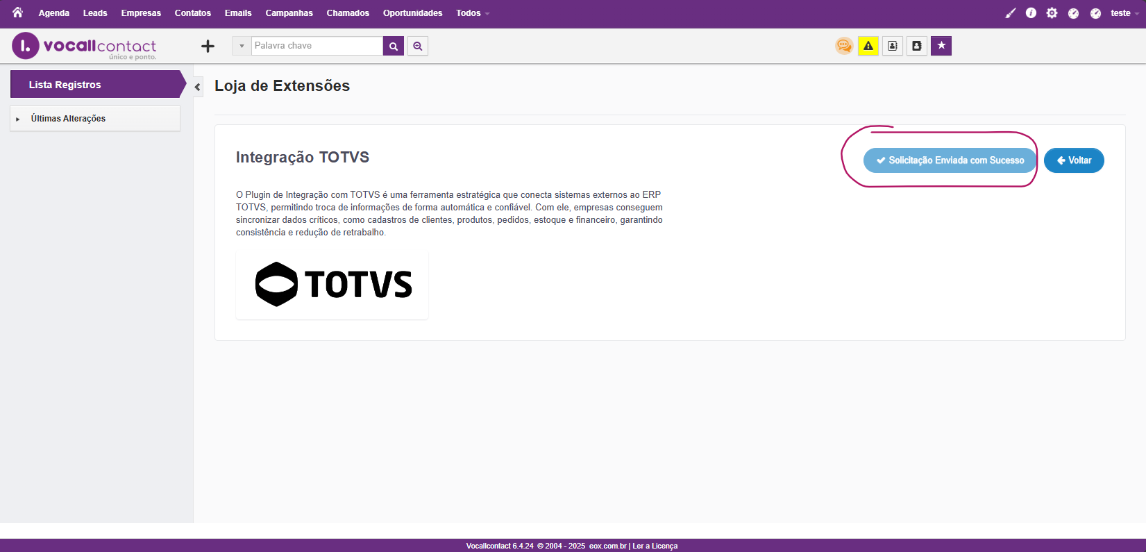 Passo 2: Solicite Novas Funcionalidades Caso identifique a necessidade de um novo módulo de ERP, utilize o botão “Solicitar Extensão”. Você deverá informar um e-mail de contato para que o sistema dispare automaticamente uma solicitação comercial, contendo o nome do cliente e a extensão desejada, agilizando o processo de licenciamento.