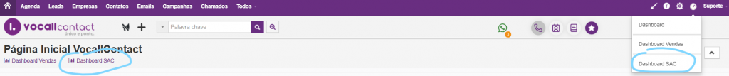 No menu principal da página inicial do VocallContact, clique no novo item “Dashboard SAC”.